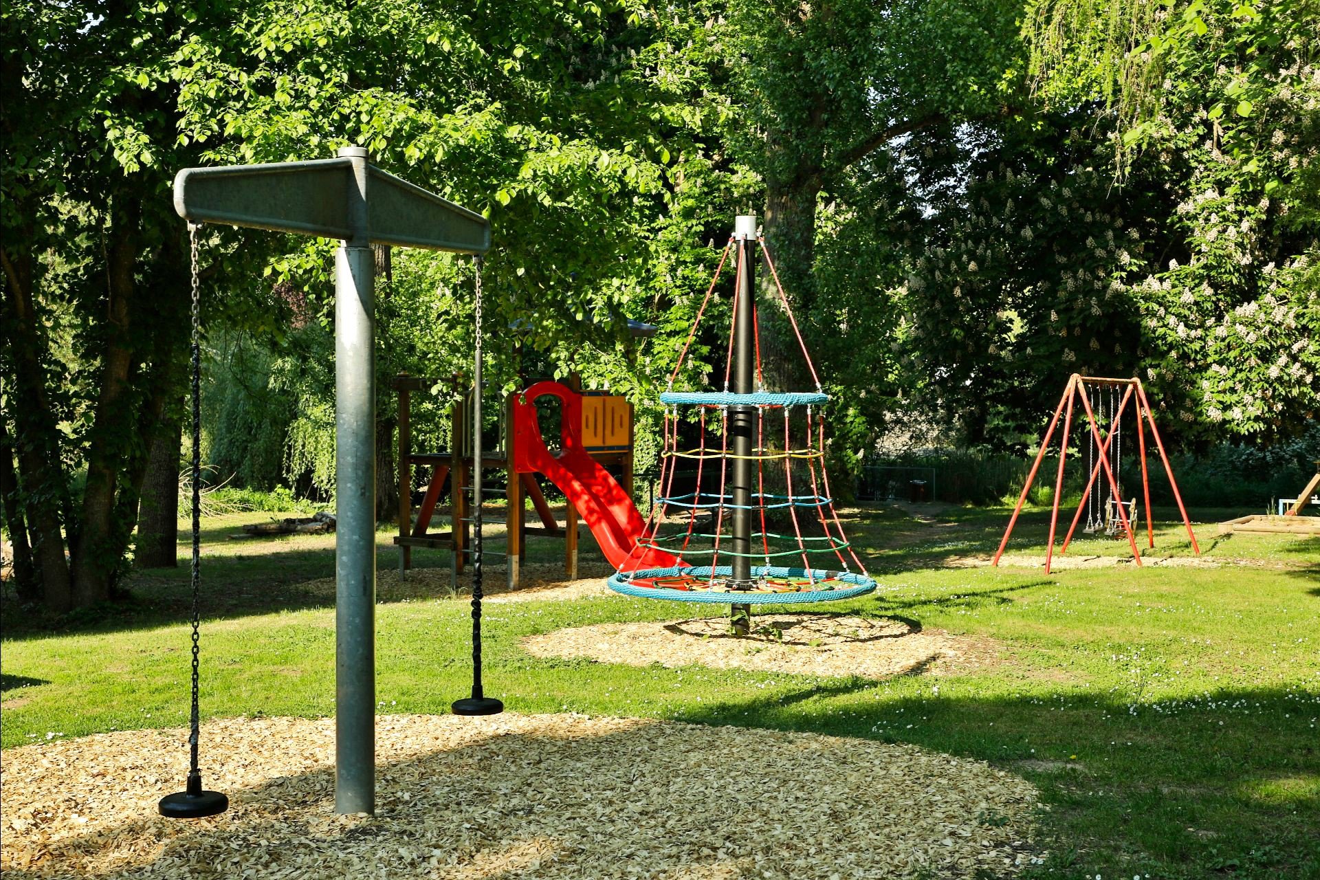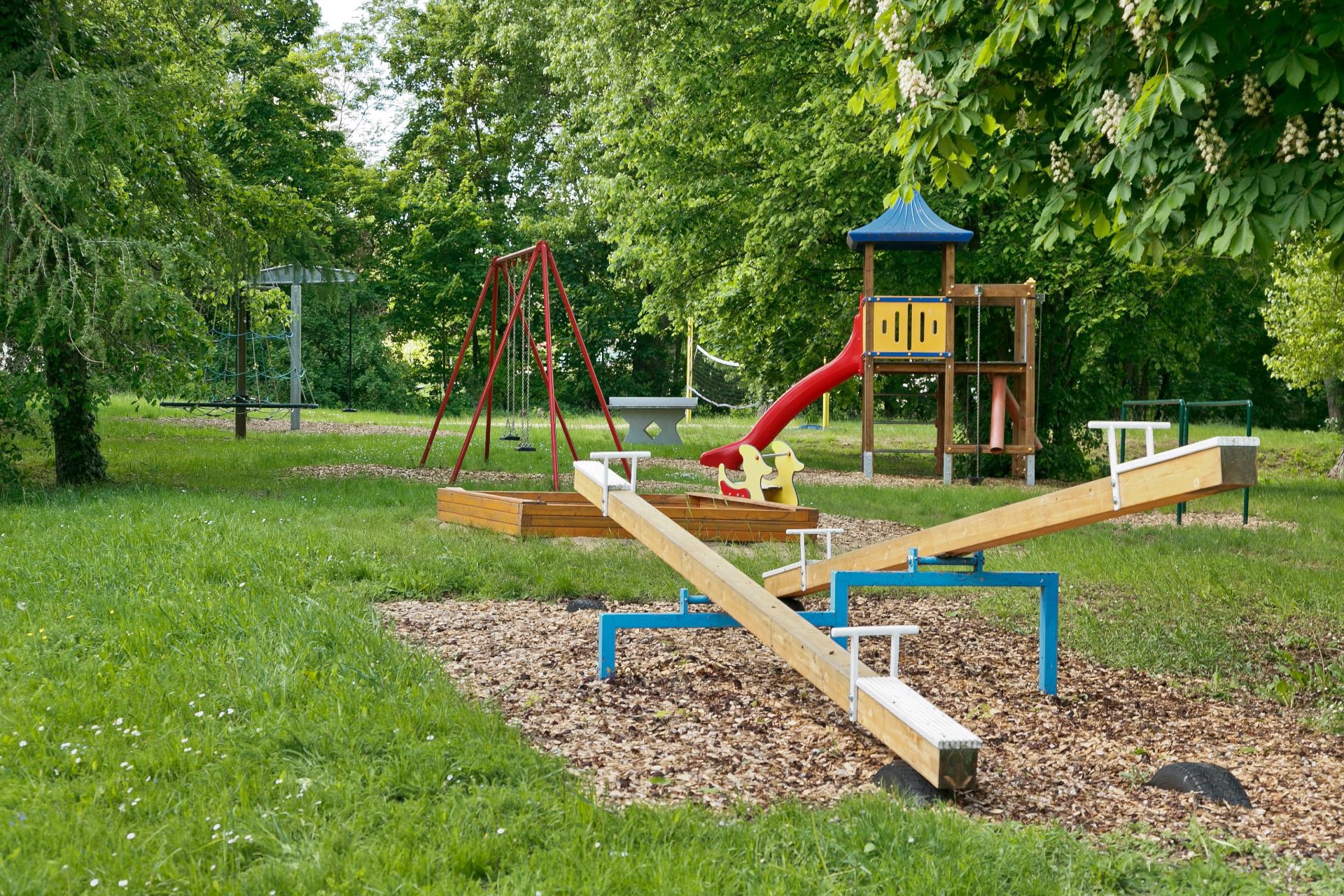 Het terrein van camping Frickenhausen wordt door verschillende bomen en heesters gestructureerd, en een klein gedeelte van de camping ligt apart aan de andere kant van een zijrivier van de Main.