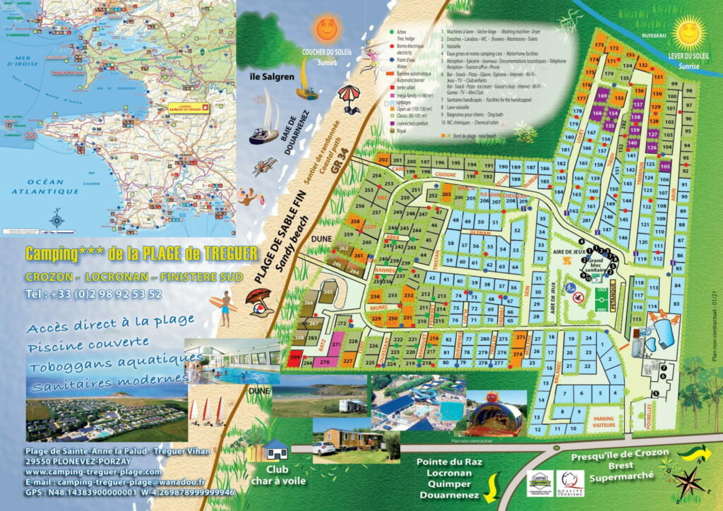 Camping La Plage de Treguer is gelegen aan de baai van Douarnenez, in het departement Finistère aan de westkust van Frankrijk. Het is een echte familiecamping. Camping Plage de Treguer ligt pal aan zee met een langgerekt strand met lage duinen en ongerepte natuur. Hierdoor krijg je het gevoel op een eiland te zijn. Op de camping kun je genieten van het zwembad en de vele activiteiten die georganiseerd worden voor alle leeftijden. Deze zonnig gelegen camping ligt op korte afstand van Quimper en Douarnenez.Door de ligging net achter de duinen zijn de meeste kampeerplaatsen slechts beschut door heg en staan soms op een open veld. Er zijn ook accommodaties die verhuurd worden zoals chaltes en ingerichte bungalowtenten
