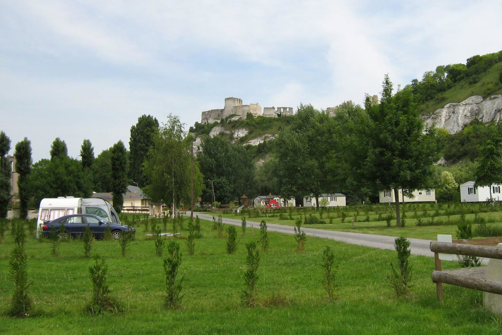 De camping ligt op een schiereiland in de Seine met uitzicht op de kasteelruïne Château Gaillard.