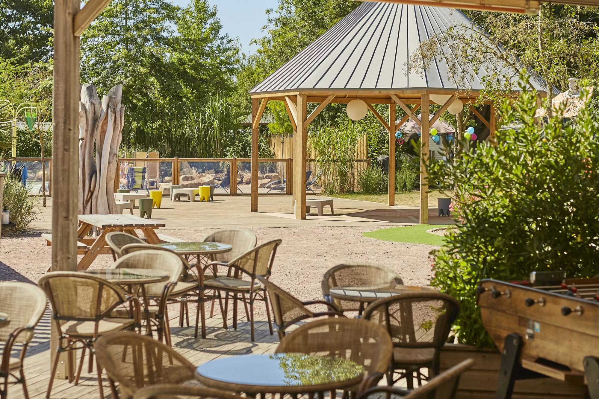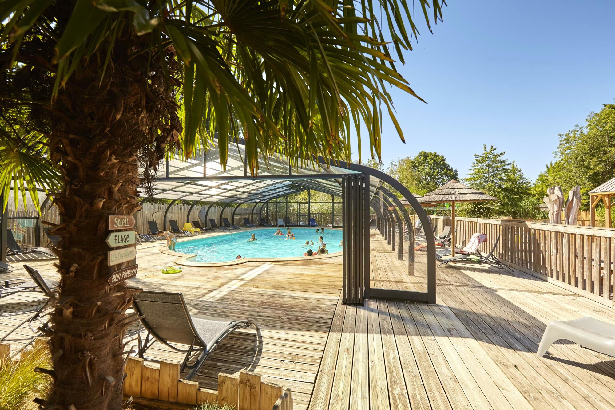 Het verwarmde buiten/binnenbad heeft een terras met ligstoelen. De kinderen kunnen lekker spelen in de speeltuin met trampoline en op het sportveld. Verder kunnen ouders zich uitleven in de fitnessruimte. In het hoogseizoen worden er regelmatig activiteiten voor alle leeftijden georganiseerd. Voor een hapje en drankje kun je bij de snackbar op de camping terecht. De camping heeft ook een klein winkeltje met wat locale en dagelijkse producten.