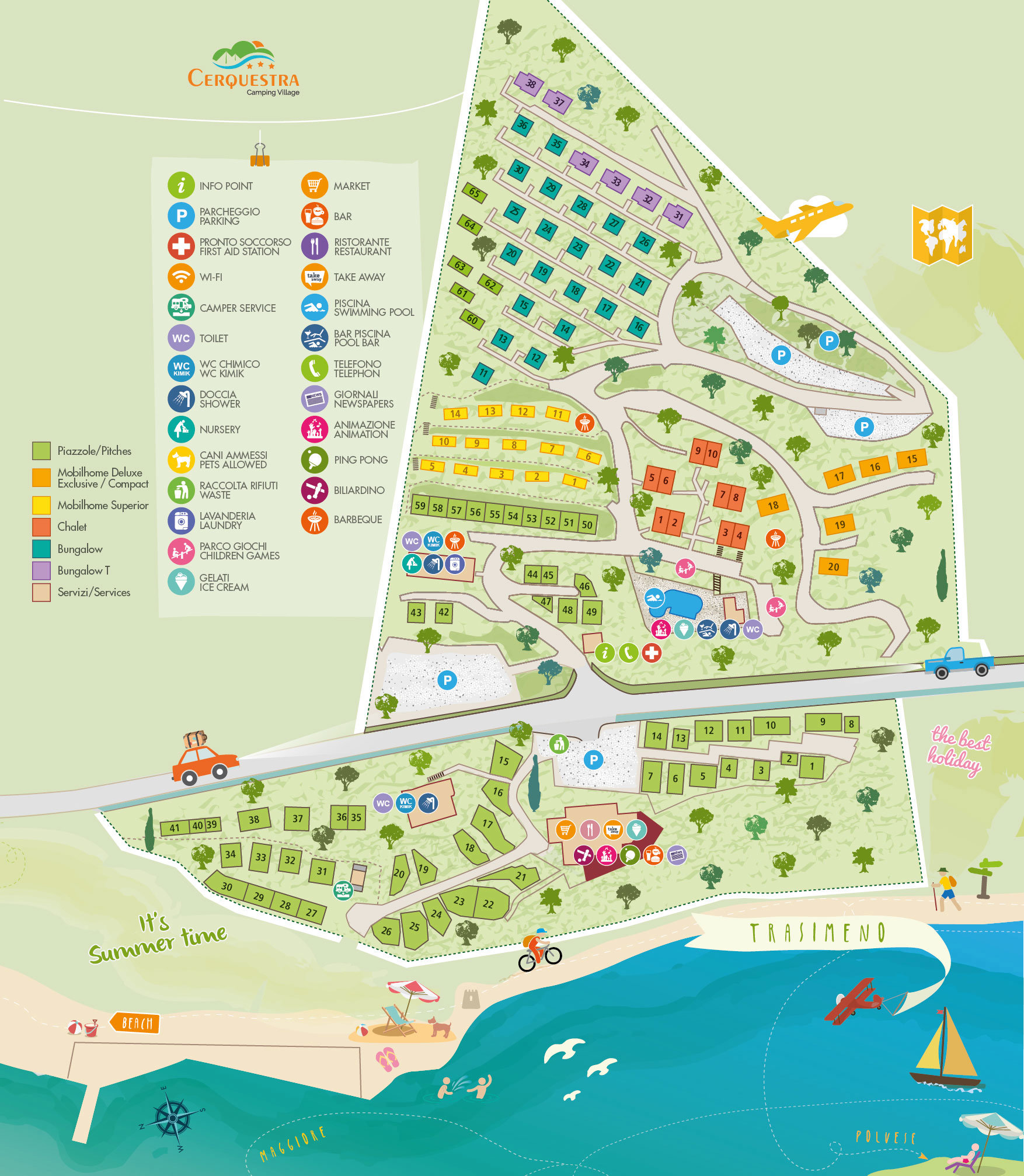 Camping Village Cerquestra is gelegen bij het plaatsje Monte del Lago, aan de oostkant van het Trasimenomeer. Deze driesterren camping beschikt over 70 plaatsen op ca. 5 ha. In perfecte harmonie met de omringende dichte begroeiing, loopt de camping uit in een eikenbos en een olijvengaard. Vanaf de camping, in terrasvorm aangelegd heb je geweldige uitzichten over het meer! De vriendelijke en familiaire sfeer op de camping doet menig vakantieganger terugkomen.Lekker genieten en voor waterratjes water genoeg