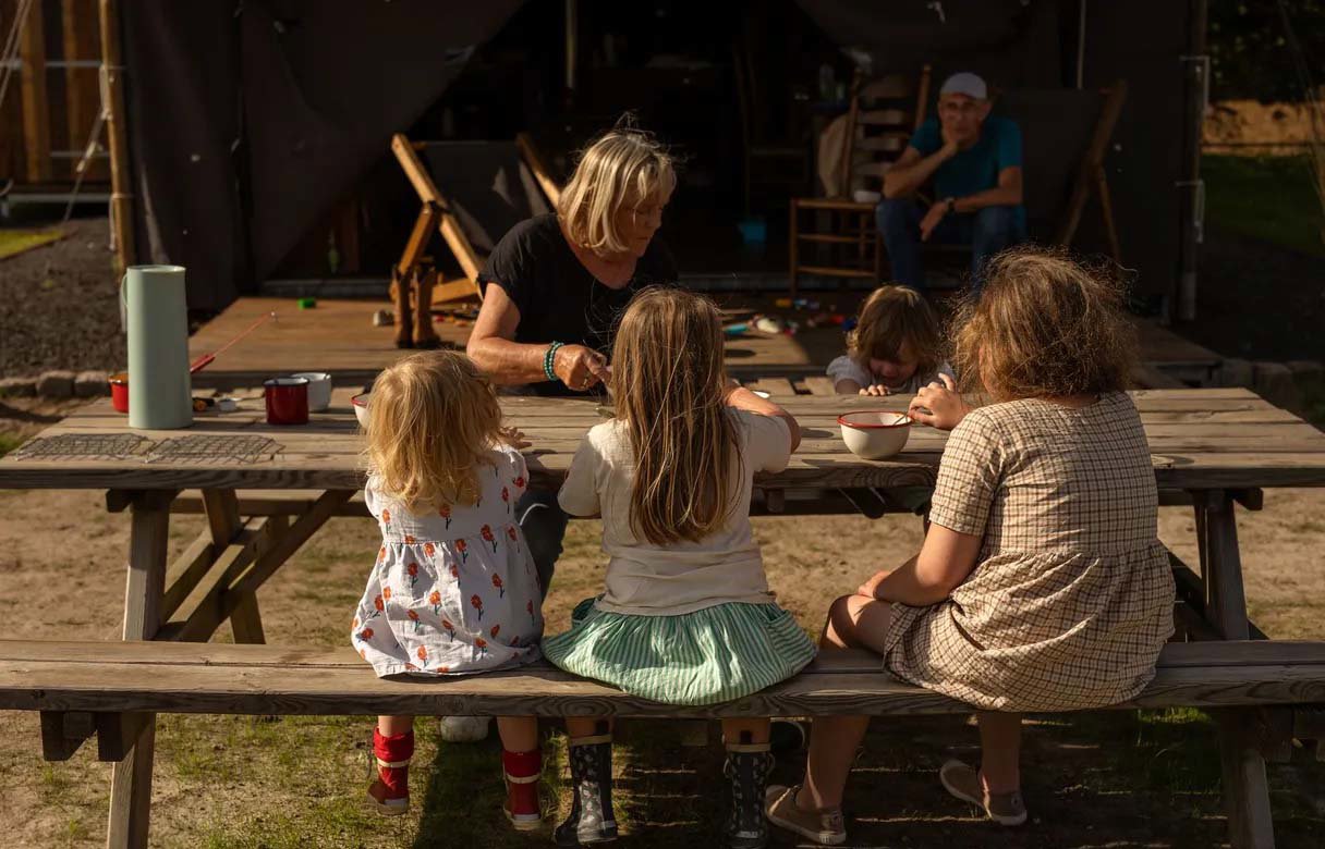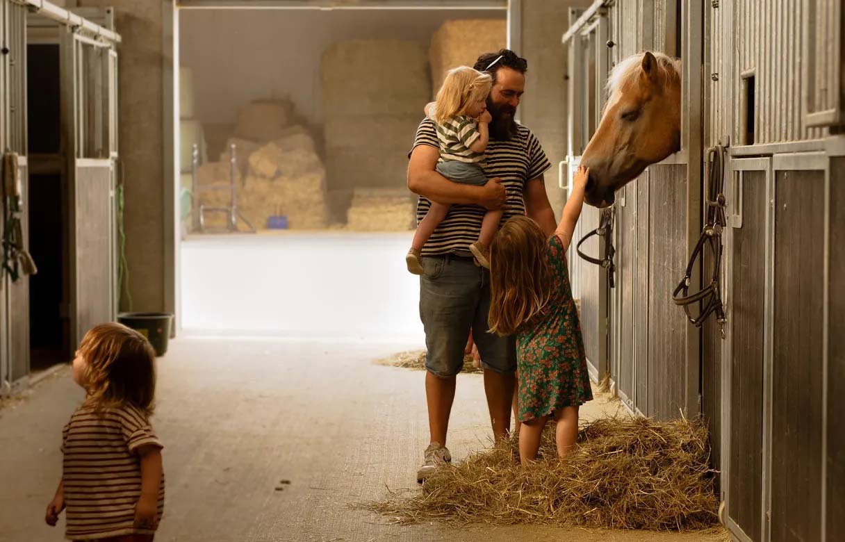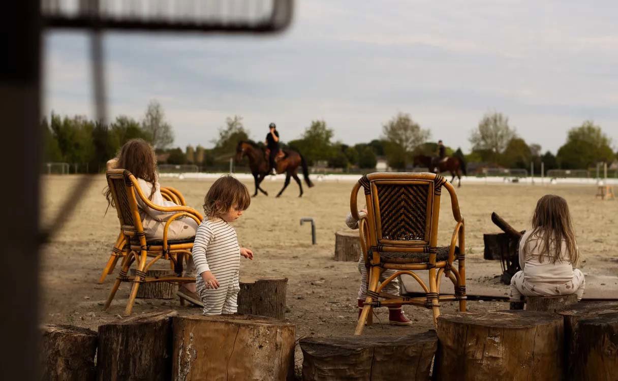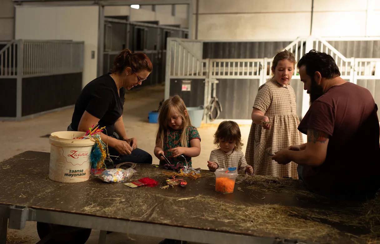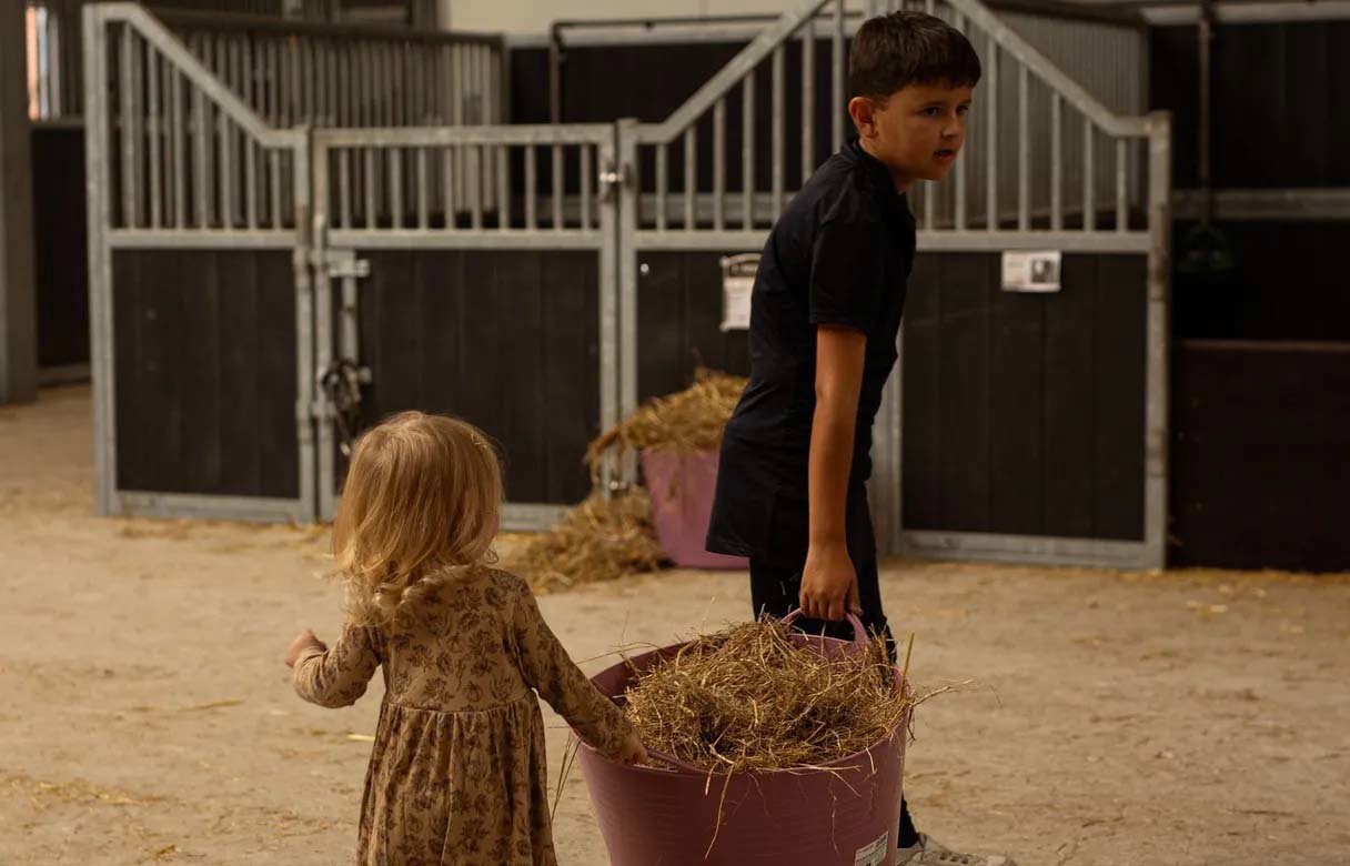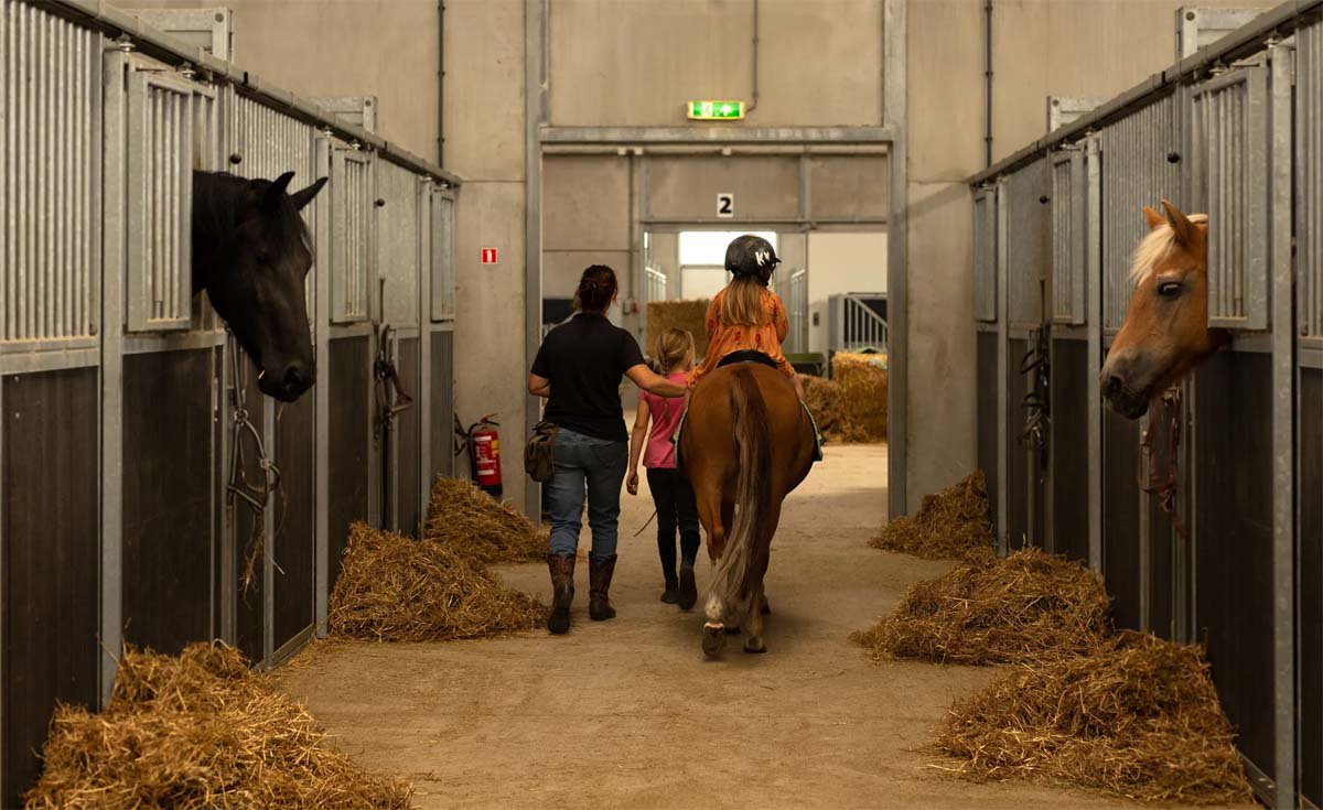Kinderen helpen mee met voeren, borstelen en knuffelen in de stal en kijken mee achter de schermen van de manege. Paardrijles of een ritje kan in overleg worden geregeld en zelfs je eigen pony mag – tegen een kleine vergoeding – mee op vakantie. Klein, overzichtelijk en heerlijk persoonlijk: ideaal voor gezinnen die samen willen genieten van rust en ruimte.