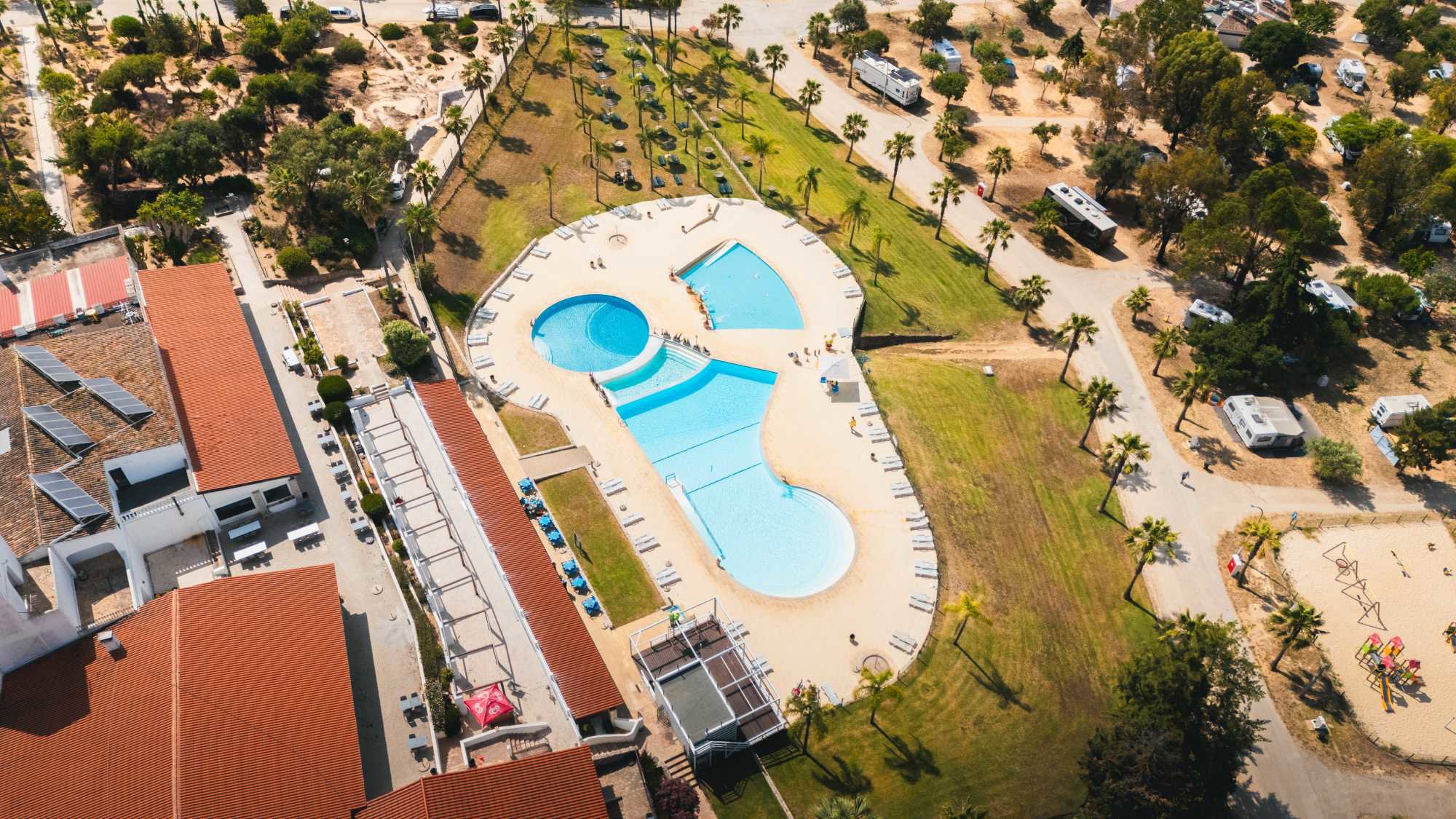 Centraal op het terrein bevindt zich een waaiervormig zwembadcomplex met drie baden. Er is een ruim bad om baantjes te trekken, een tweede bad voor verkoeling en een speciaal splashpool voor peuters. Voor sportieve ontspanning zijn er tennisbanen, een indoor gym en fitnesslessen beschikbaar. Voor maaltijden kunnen gasten terecht in het restaurant, dat Portugese specialiteiten en verse vis serveert, of bij de pizzeria voor houtovenpizza's. Daarnaast beschikt de camping over drie bars, een winkel en een wasserette. In het hoogseizoen is er een activiteitenprogramma voor kinderen en avondentertainment.